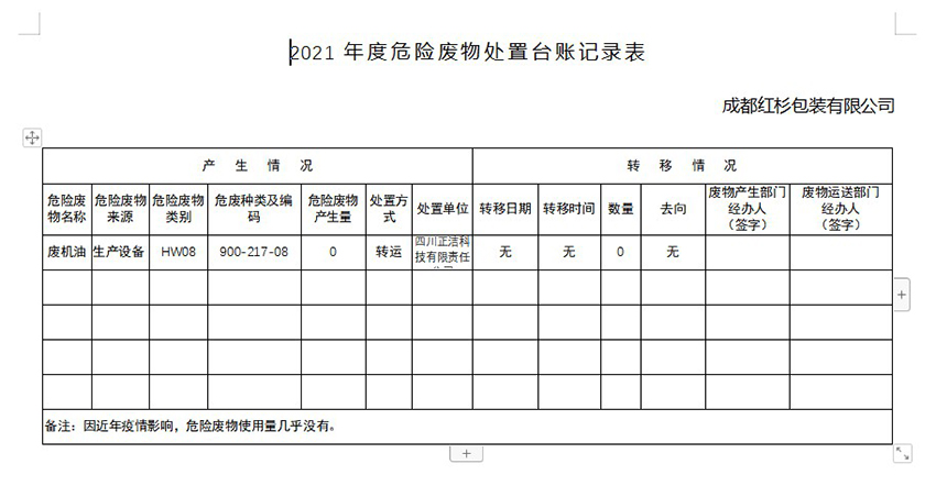 成都紅杉包裝有限公司一般工業固廢處置記錄臺...